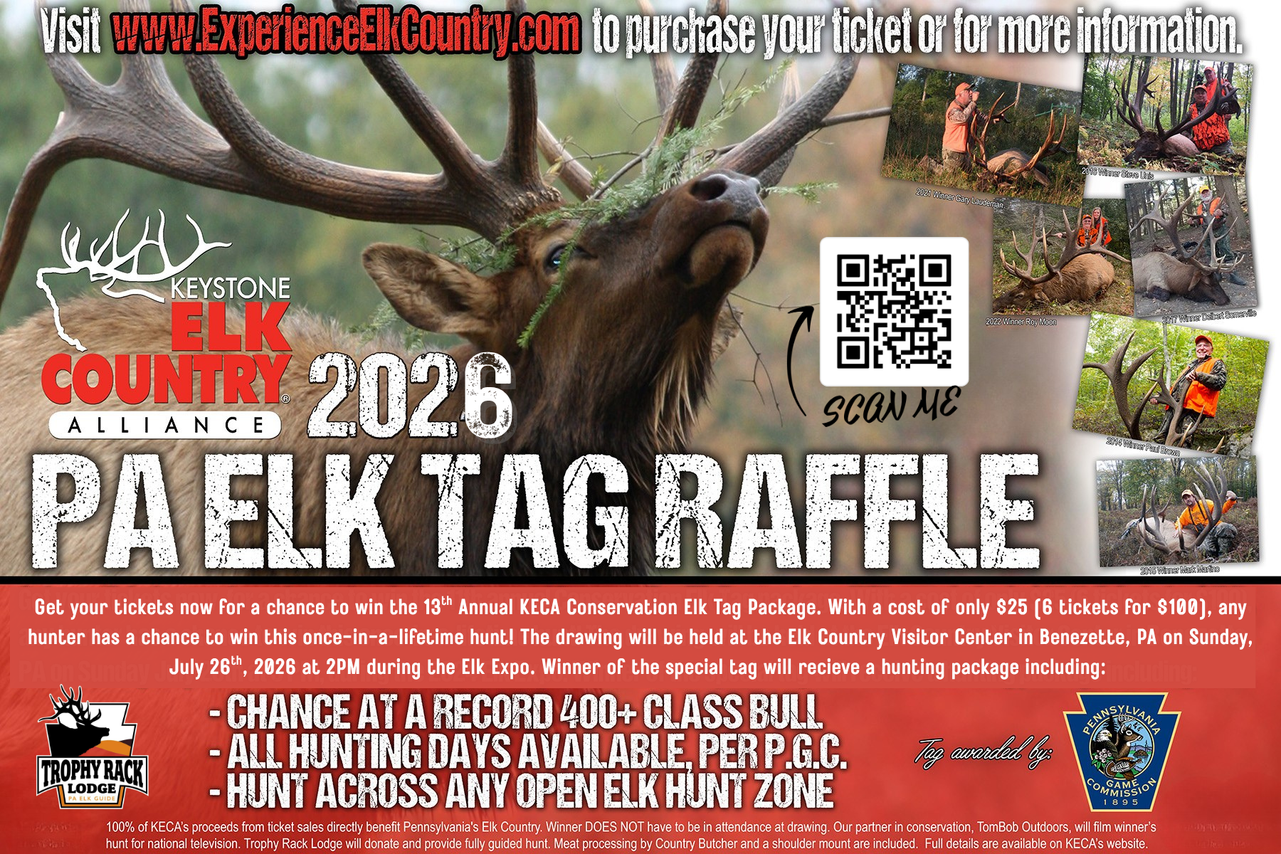 KECA has worked diligently to build the best Pennsylvania Bull Elk hunt package possible. With that in mind, our package consists of one 2026 Pa Bull Elk License along with an all-inclusive accessory package of: Guided 6-day hunt with lodging and meals by Trophy Rack Lodge, taxidermy ready skin/cape and regular cut/wrap meat processing by Country Butcher, LLC along with a shoulder mount.  Hunt will be filmed by TomBob Outdoors for airing on Friends in Wild Places.Â