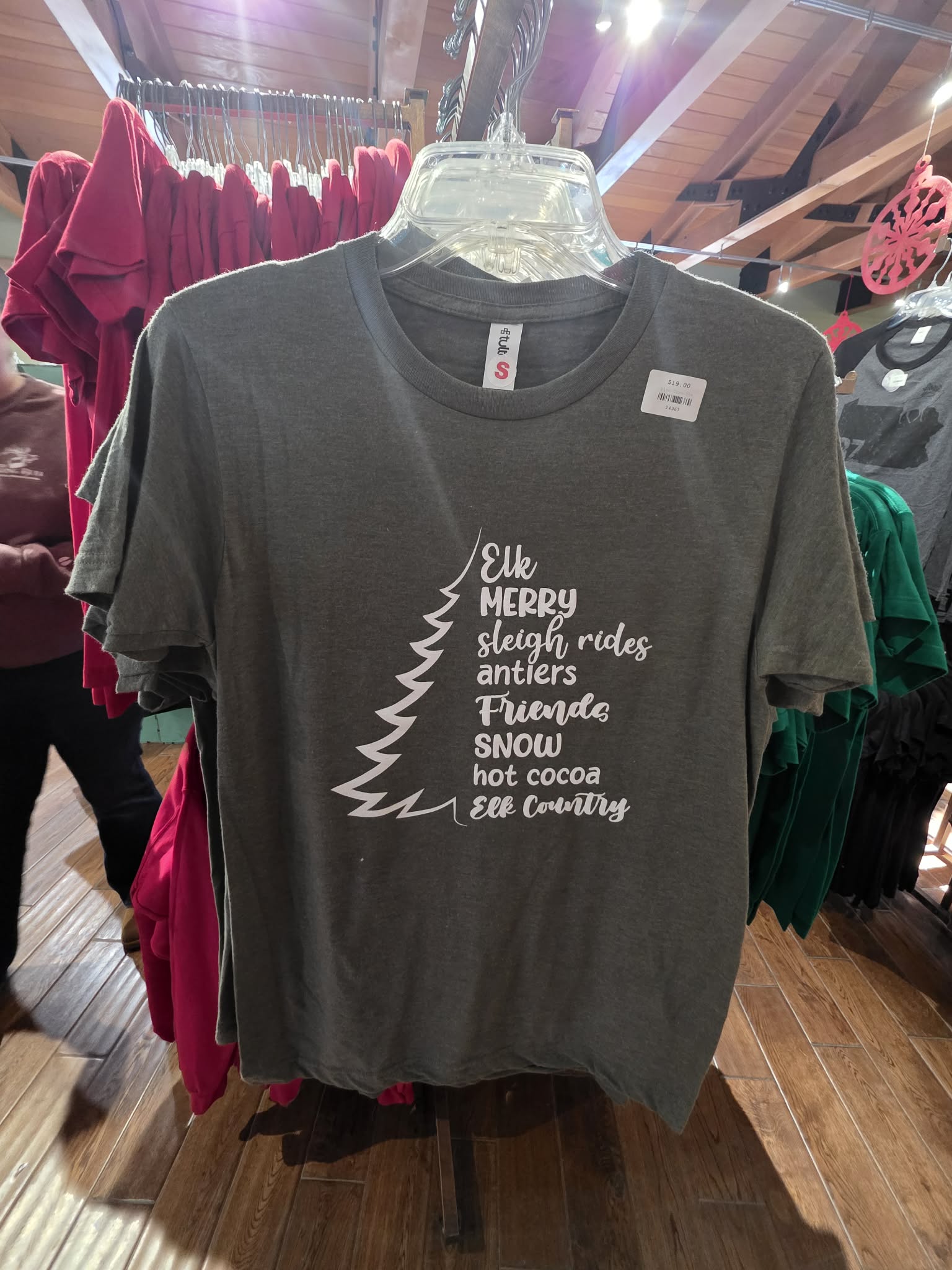 Celebrate the simple joys of the season with our Elk Country Holiday graphic tee. This soft charcoal-gray shirt features a unique Christmas tree design made up of festive words like merry, sleigh rides, antlers, friends, snow, and hot cocoa, finished with a rustic Elk Country touch that’s perfect for winter lovers and outdoor enthusiasts alike.